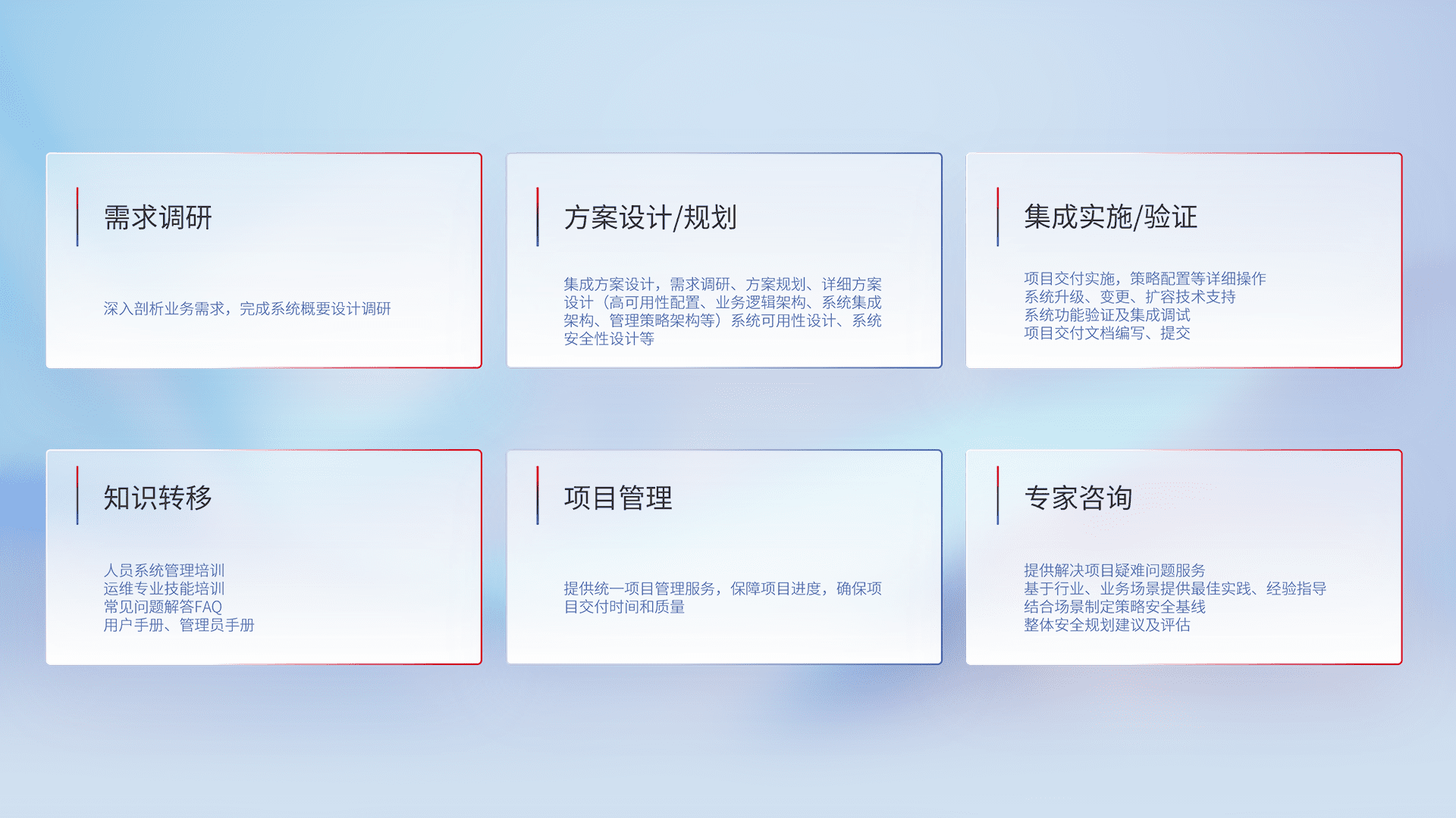针对客户行业特性,,,将宏观的安全战略和需求,,,通过专业的交付服务,,,实现项目落地,,为客户提供标准规范的集成交付服务。。